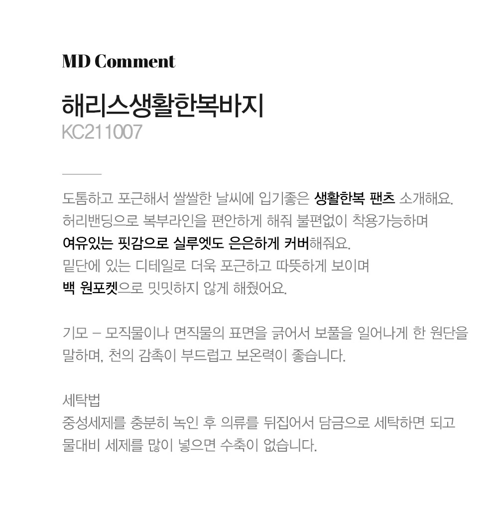 마담4060의 모든 의류 제품은 처음 1~2회 드라이크리닝을 권장합니다.