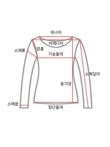 사이즈 총장 어깨 가슴(단면) 소매길이 암홀(단면) 소매통(단면) 소매단(단면) 밑단(단면) 목너비