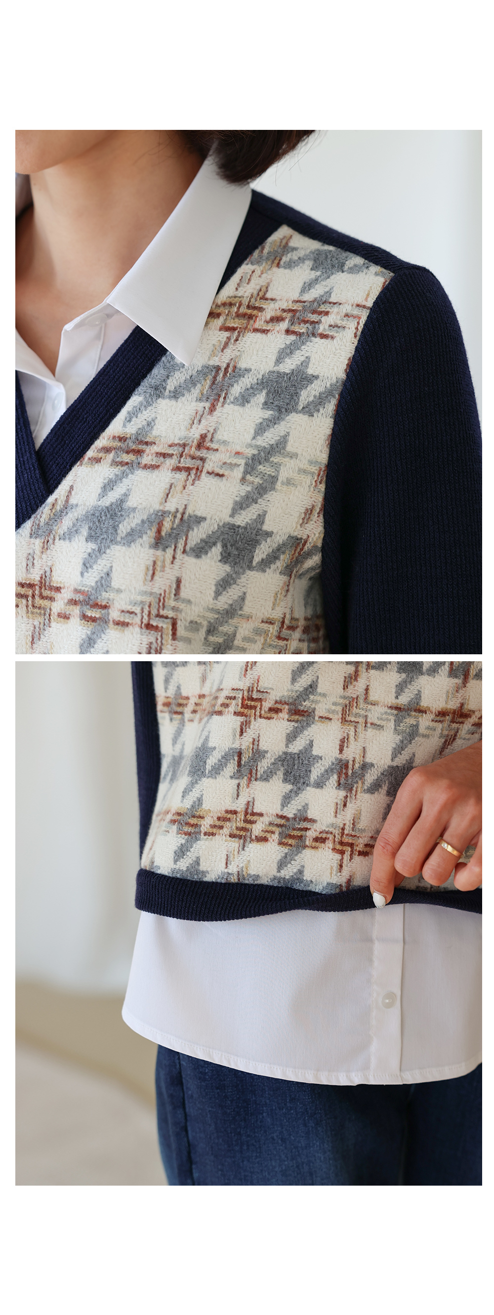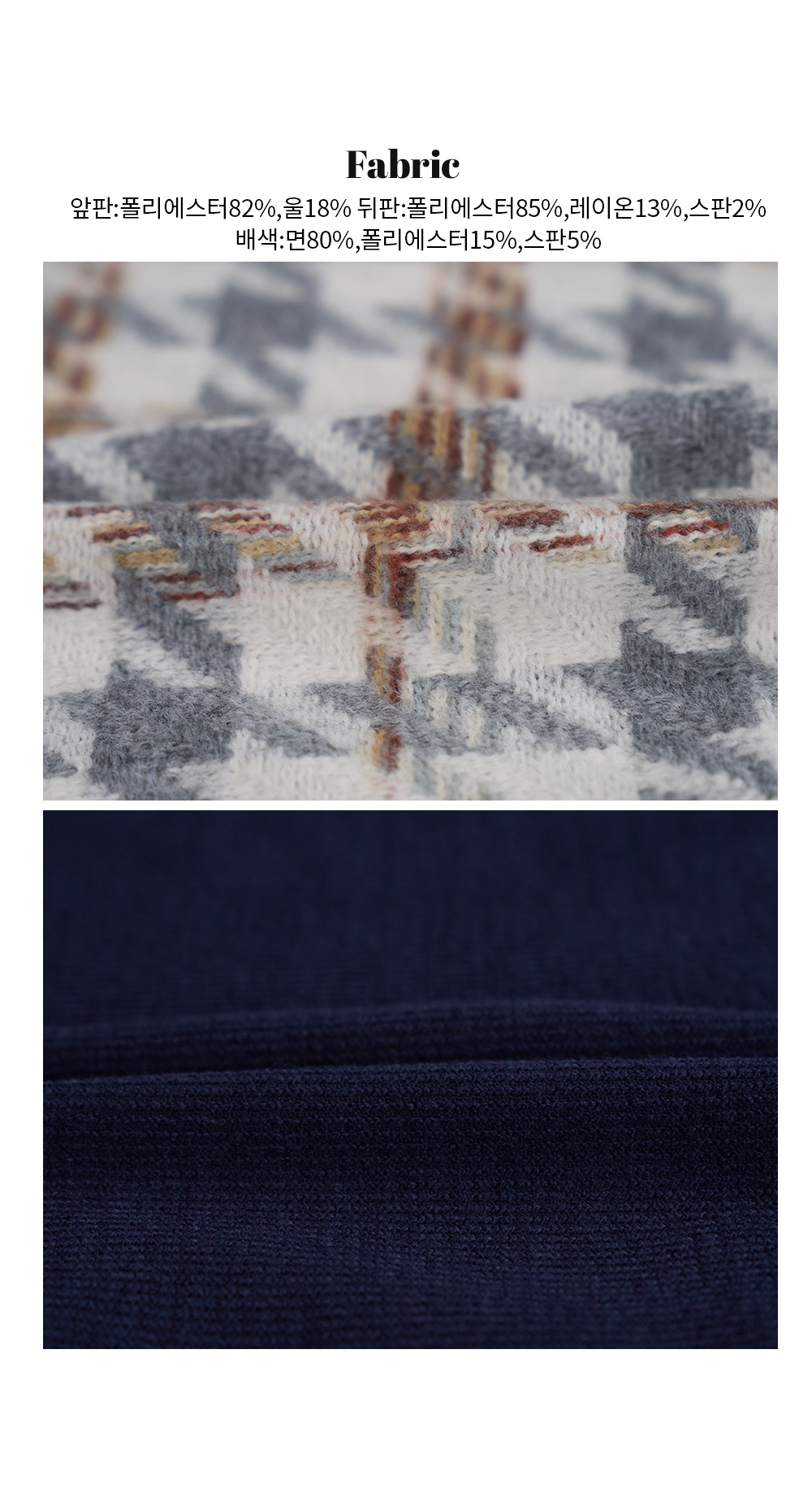 소재 앞판:폴리에스터82%,울18% 뒤판:폴리에스터85%,레이온13%,스판2% 배색:면80%,폴리에스터15%,스판5%