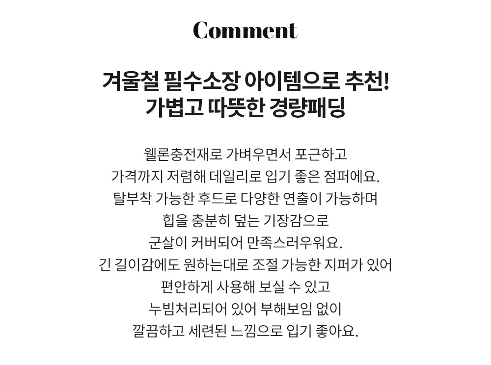 소재 겉감:폴리에스터100% 충전재:웰론100%