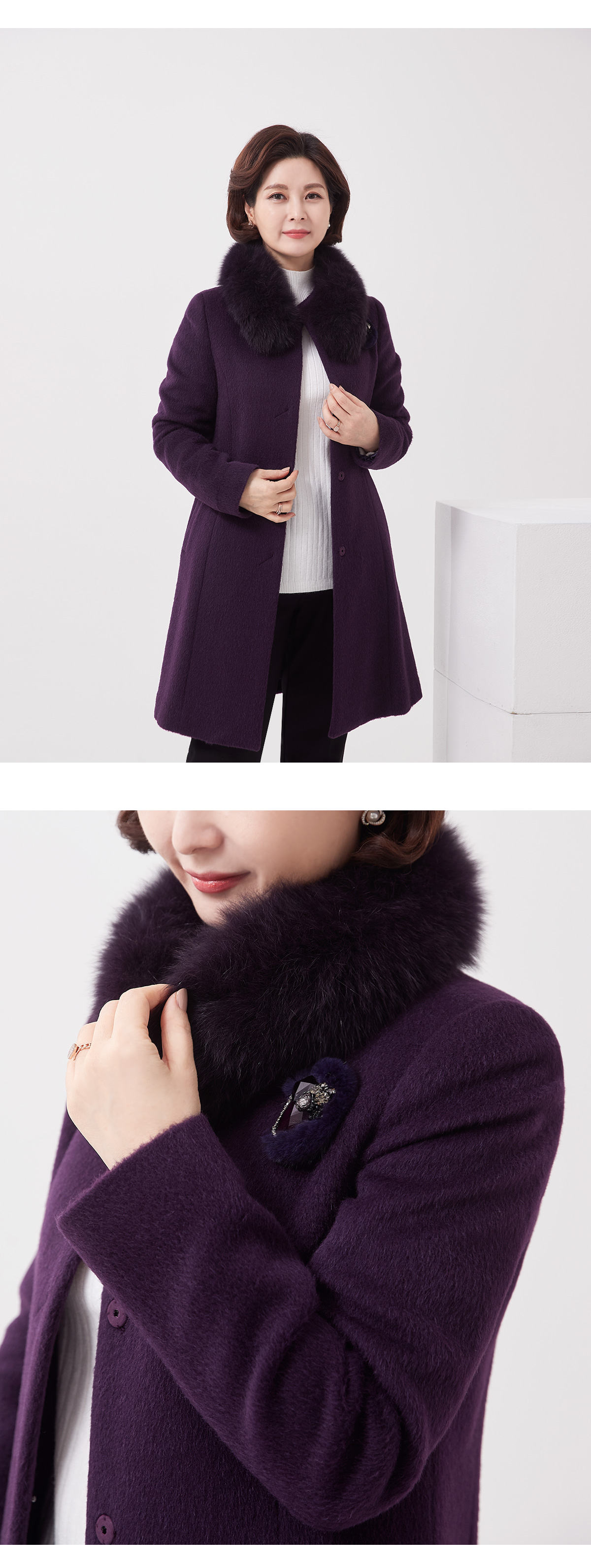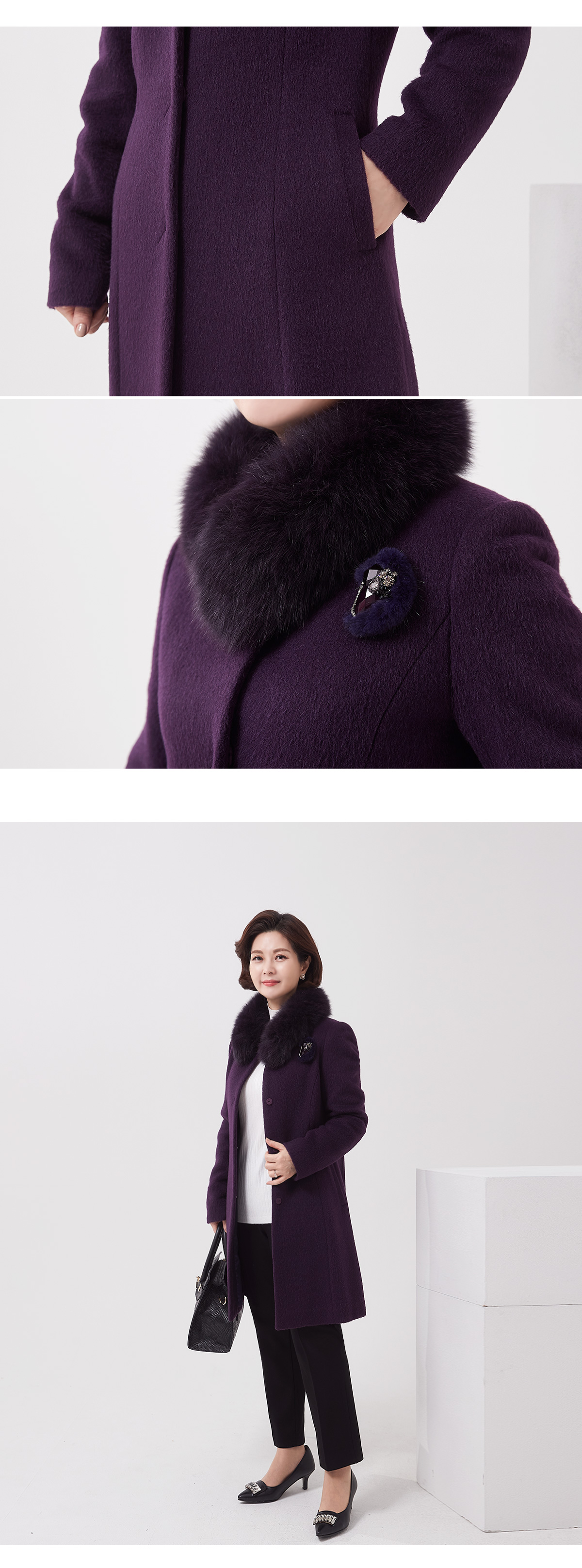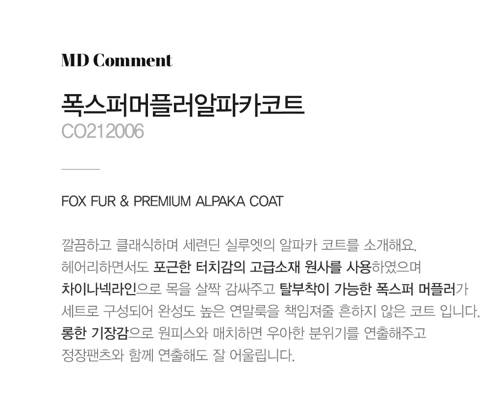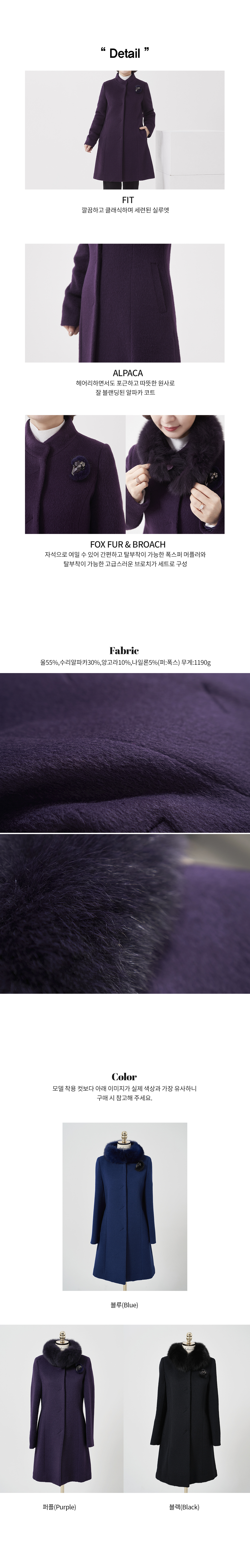 소재 울55%,수리알파카30%,앙고라10%,나일론5%(퍼:폭스) 무게:1190g