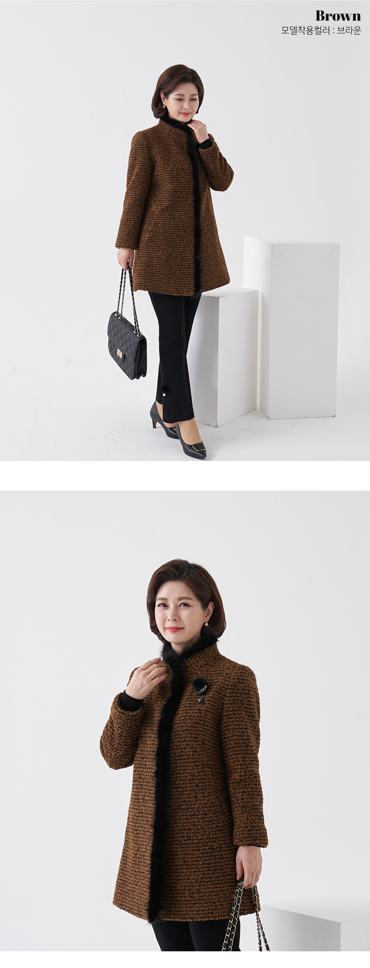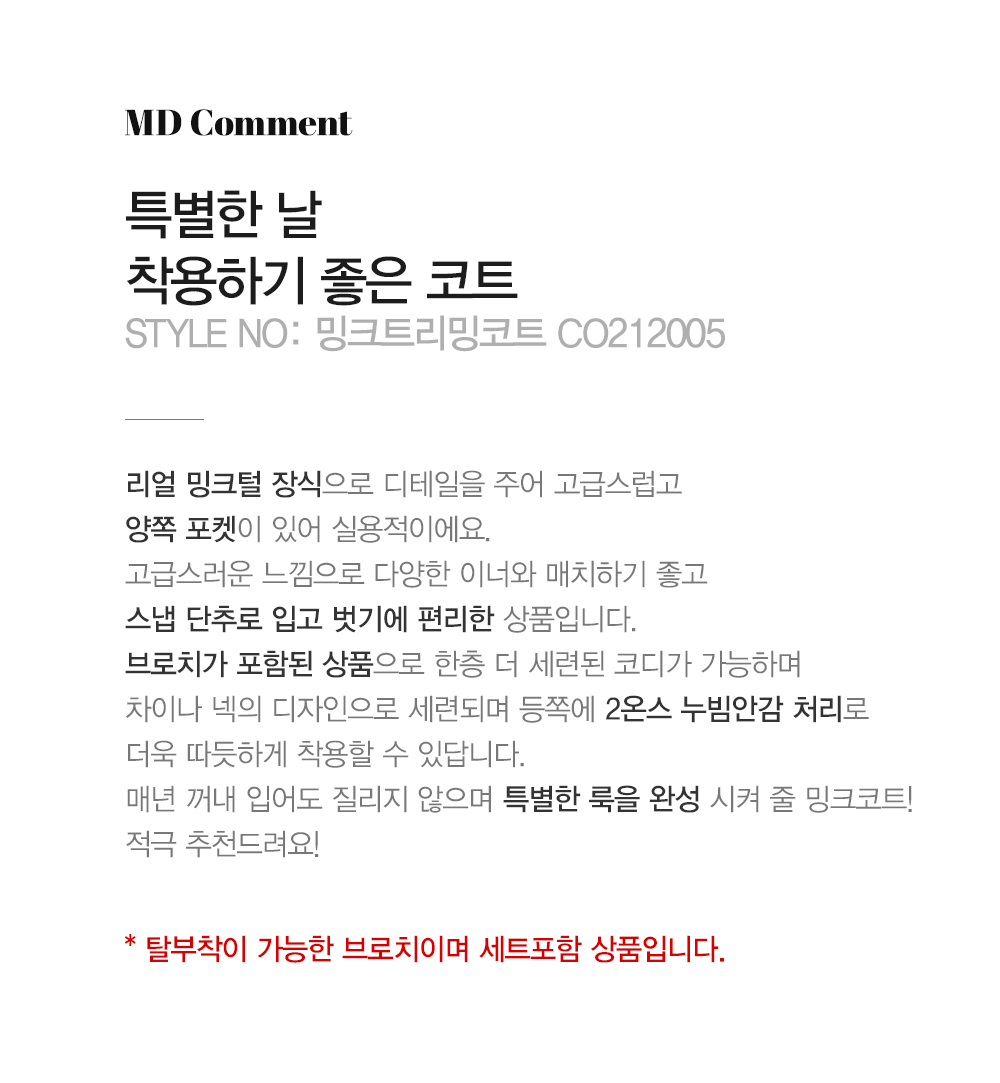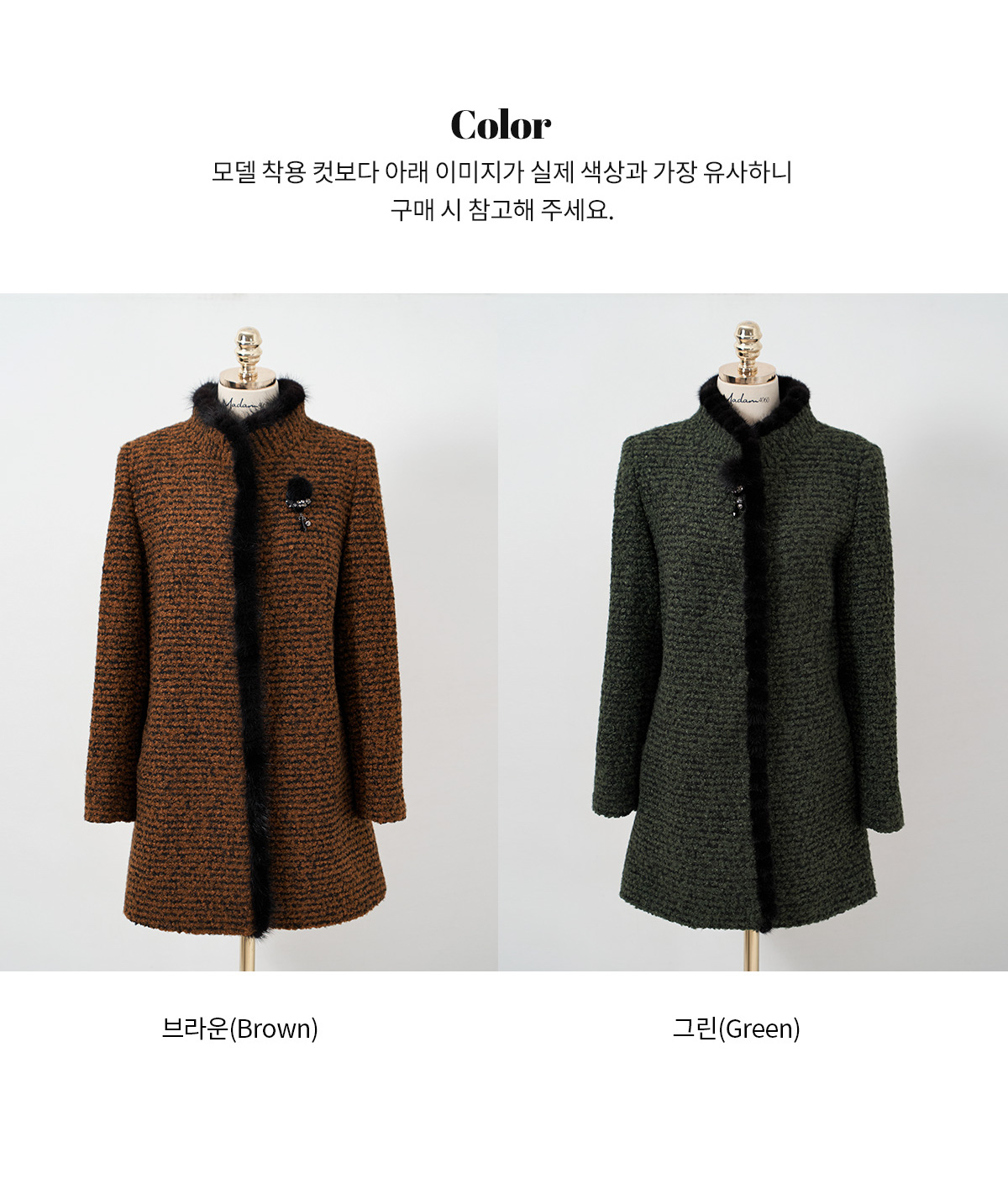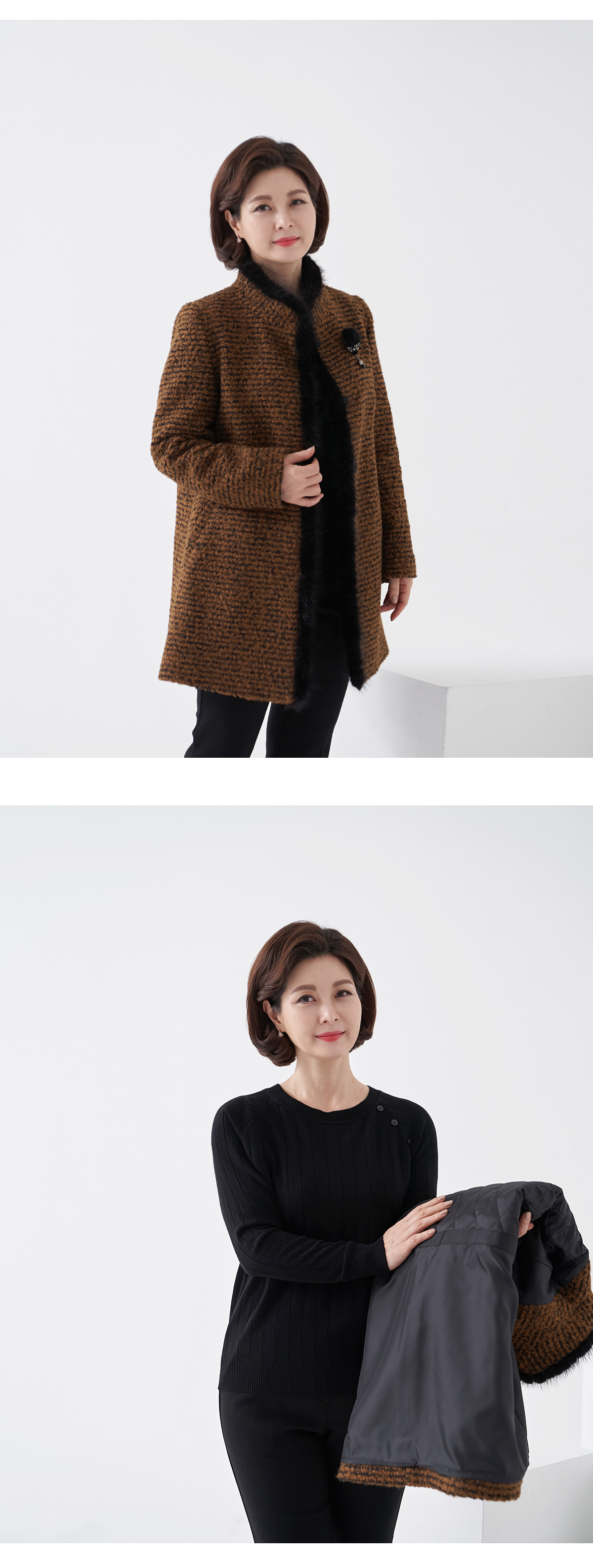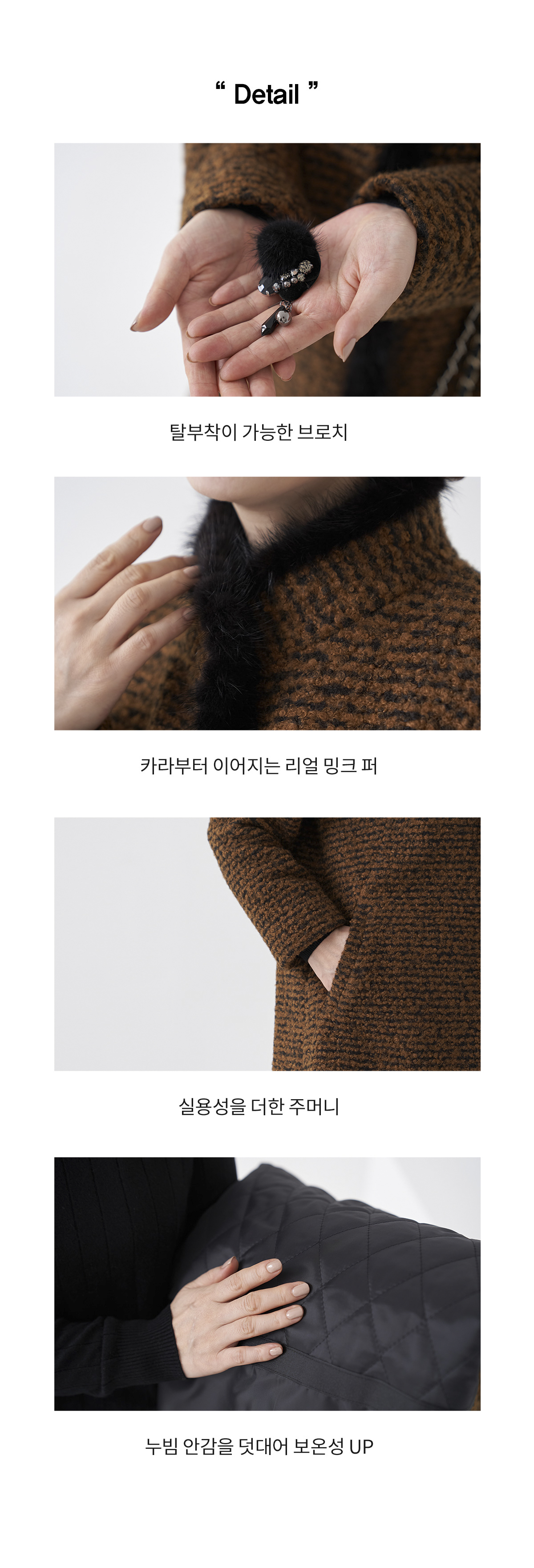 소재 폴리에스터54%,나일론23%,아크릴23% 누빔 충전재:저데니아 2온스, 트리밍&브로치방울:리얼밍크, 무게:1050g