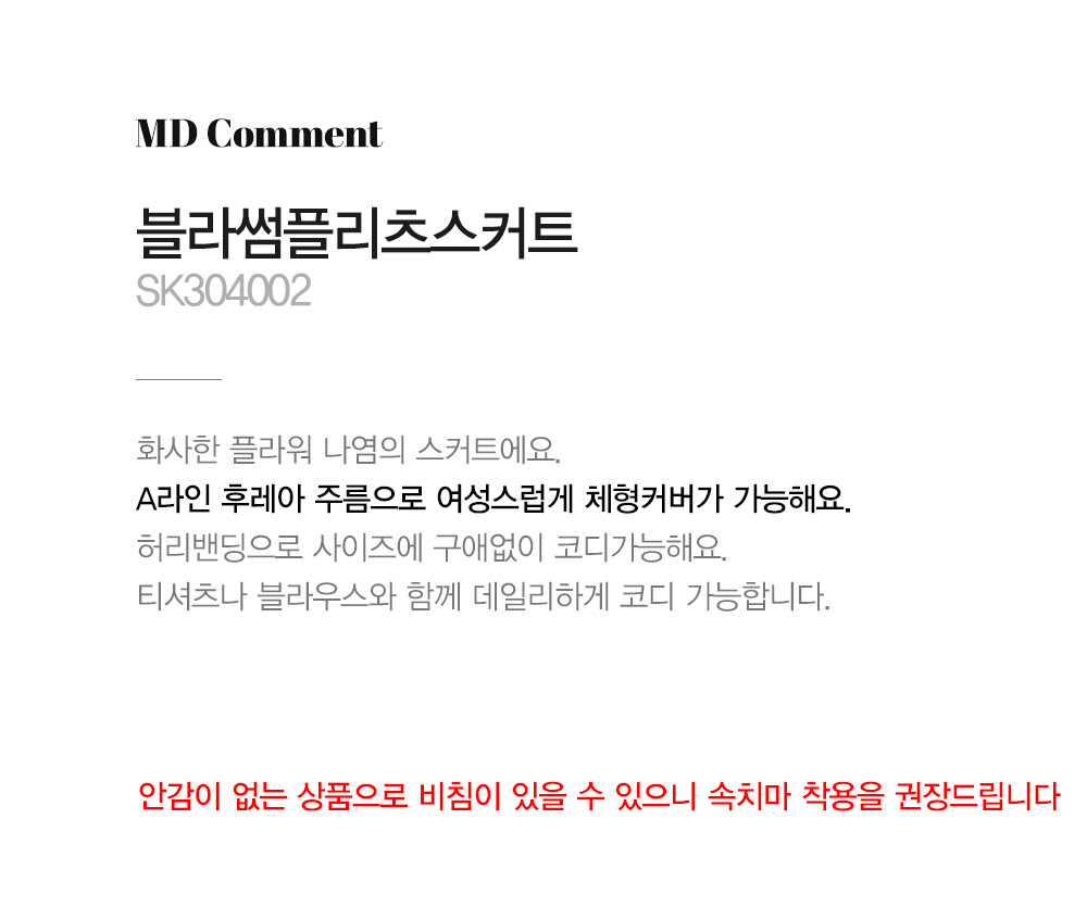- 안감이 없는 상품으로 비침이 있을 수 있으니 속치마 착용을 권장드립니다