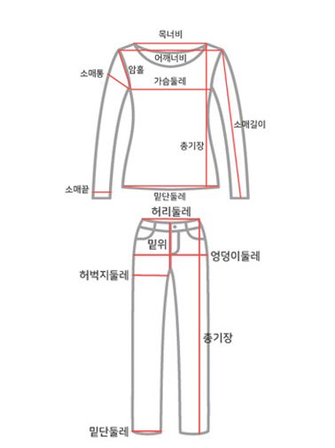 사이즈 총장(상/하) 어깨(단면)/허리(단면) 가슴(단면)/엉덩이(단면) 밑위(단면) 암홀(단면)/허벅지(단면) 밑단(단면)(상/하) 목너비