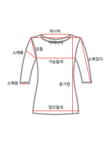 사이즈 총장 어깨 가슴(단면) 소매길이 암홀(단면) 소매통(단면) 소매단(단면) 밑단(단면) 목너비