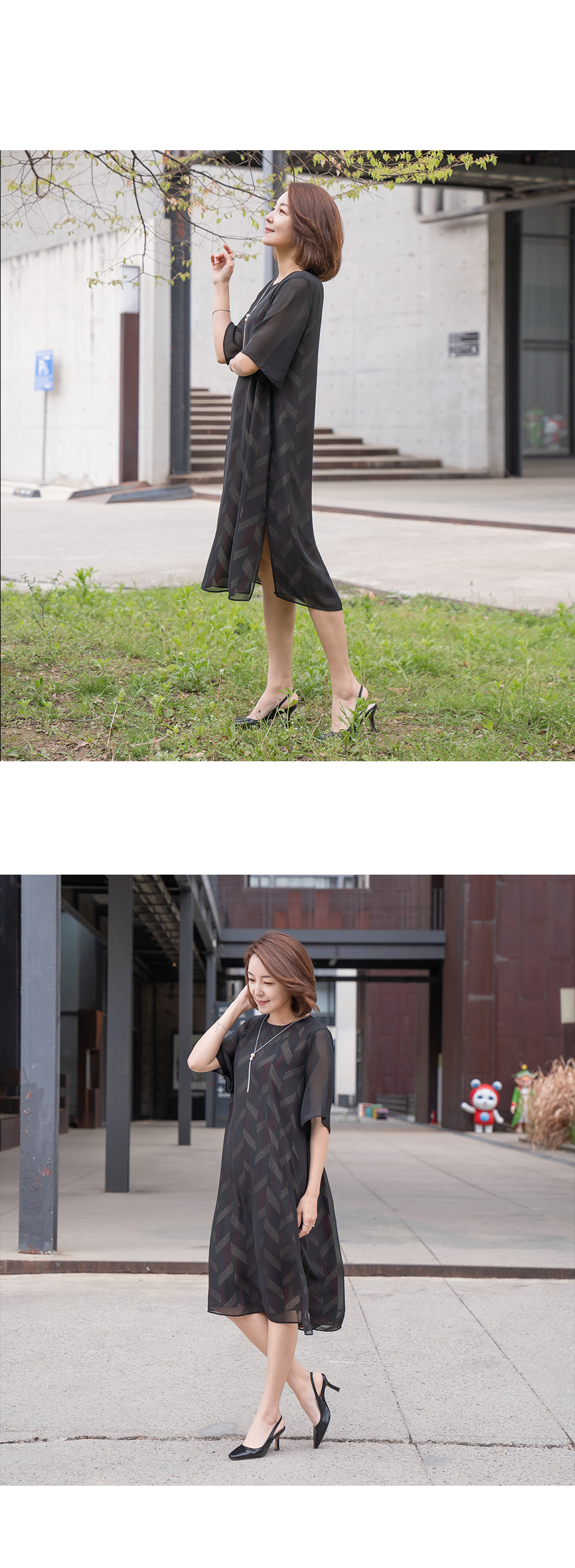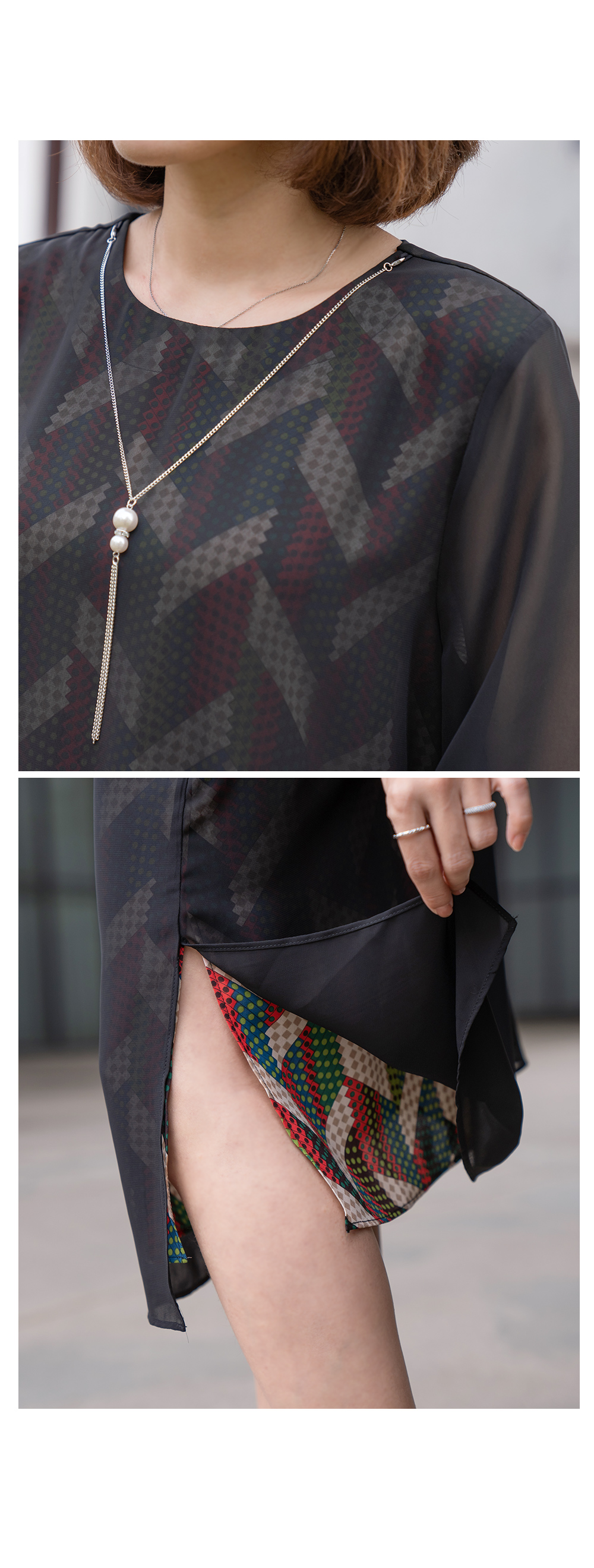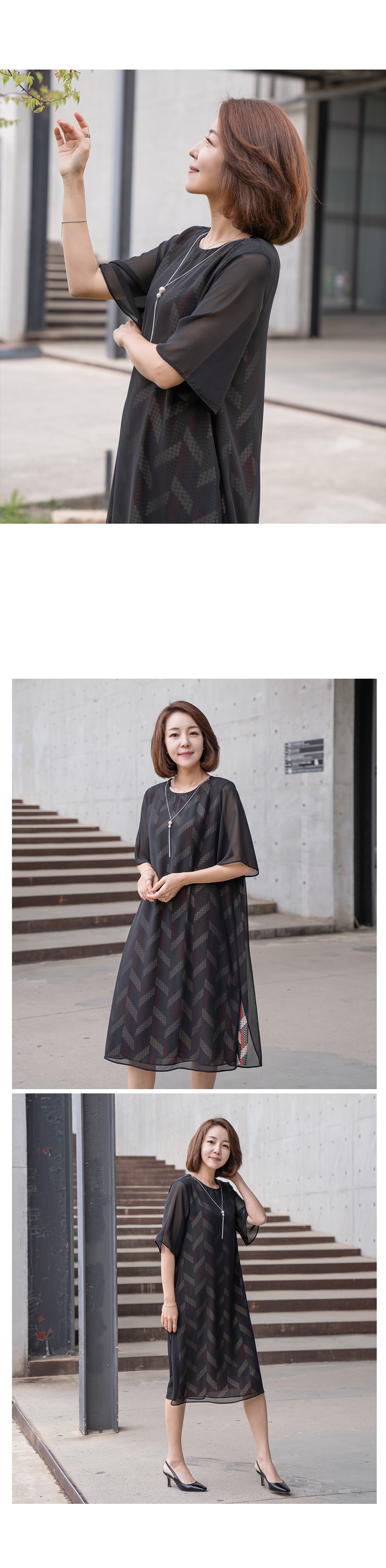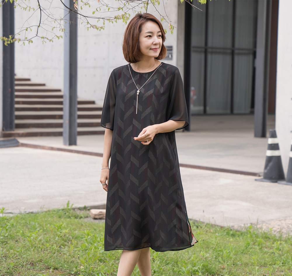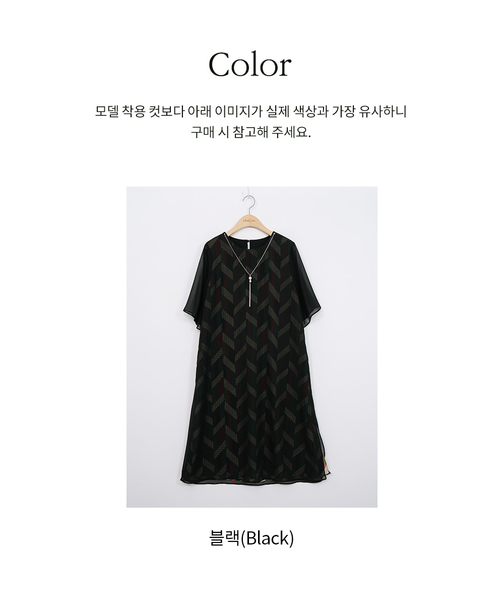 - 쉬폰이 한겹 더 겹쳐진 레이어드 스타일의 원피스에요.