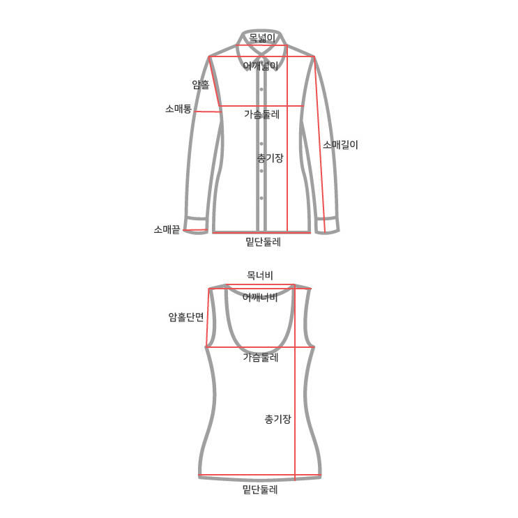 사이즈 총장(속/겉) 어깨(속/겉) 가슴단면(속/겉) 소매길이(겉) 암홀단면(속/겉) 소매통단면(겉) 소매끝단면(겉) 밑단면(속/겉) 목너비(속)