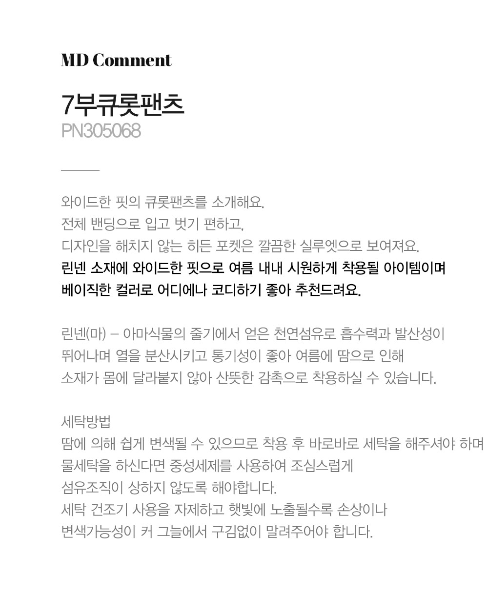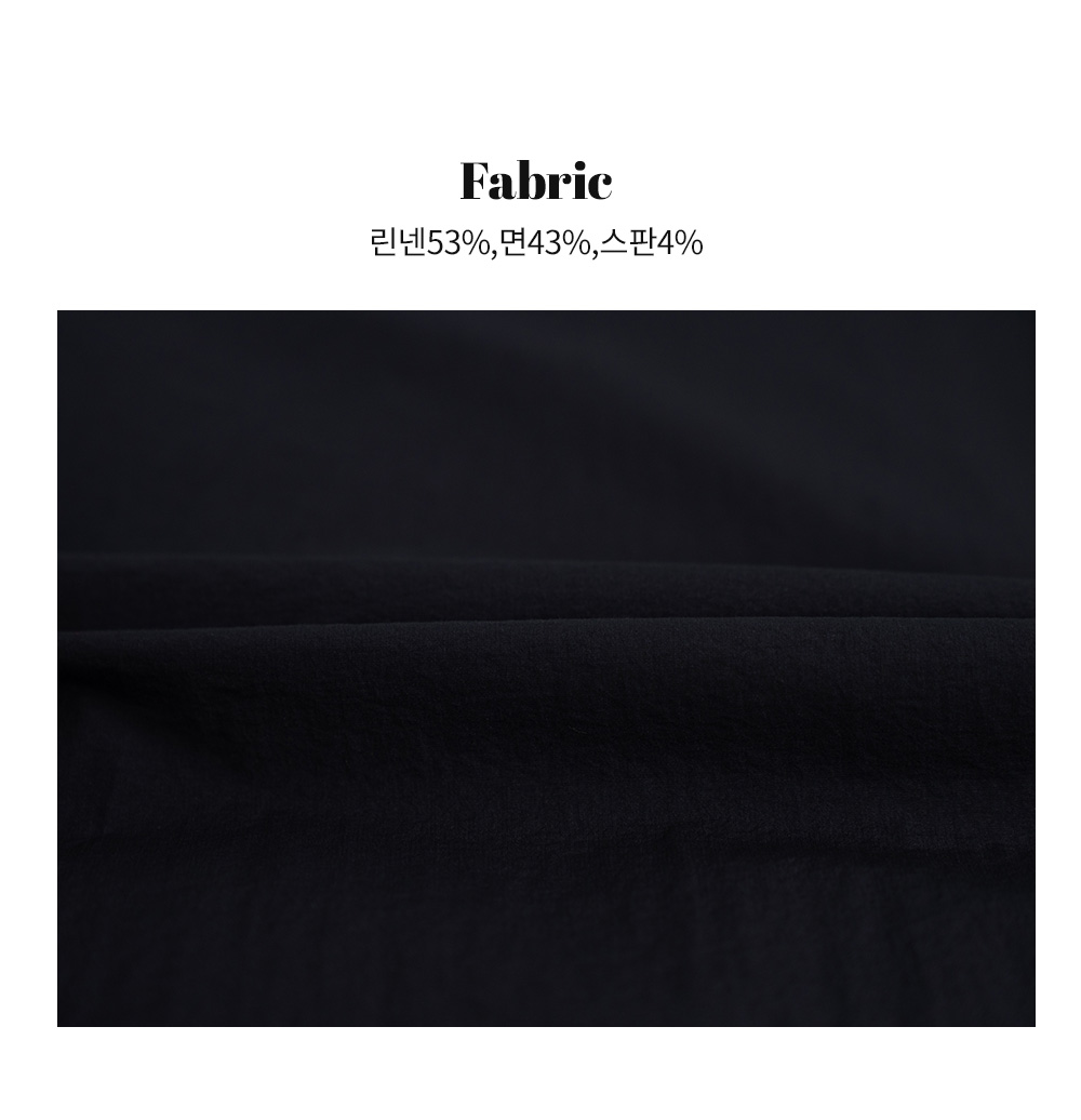 린넨(마) - 아마식물의 줄기에서 얻은 천연섬유로 흡수력과 발산성이 뛰어나며 열을 분산시키고 통기성이 좋아 여름에 땀으로 인해 소재가 몸에 달라붙지 않아 산뜻한 감촉으로 착용하실 수 있습니다.