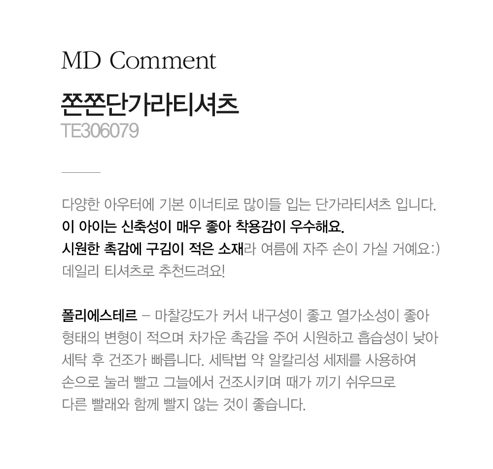 폴리에스테르 - 마찰강도가 커서 내구성이 좋고 열가소성이 좋아 형태의 변형이 적으며 차가운 촉감을 주어 시원하고 흡습성이 낮아 세탁 후 건조가 빠릅니다.