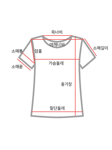 사이즈 총장 어깨 가슴(단면) 소매길이 암홀(단면) 소매통(단면) 소매단(단면) 밑단(단면) 목너비