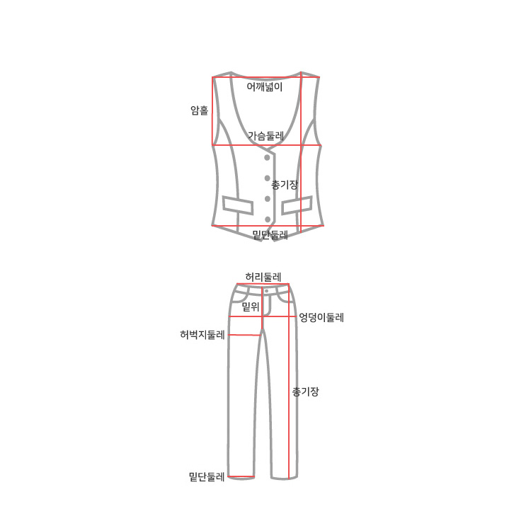 사이즈 총장(상/하) 어깨(단면)/허리(단면) 가슴(단면)/엉덩이(단면) 밑위(단면) 암홀(단면)/허벅지(단면) 밑단(단면)(상/하)