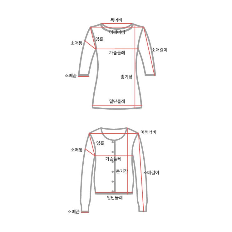 사이즈 총장(속/겉) 어깨(속/겉) 가슴단면(속/겉) 소매길이(속/겉) 암홀단면(속/겉) 소매통단면(속/겉) 소매끝단면(속/겉) 밑단면(속/겉) 목너비(속)