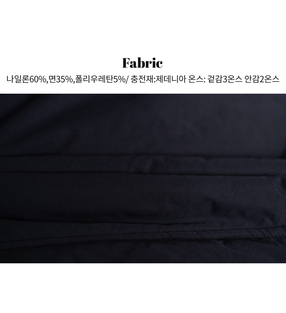 소재 나일론60%,면35%,폴리우레탄5%/ 충전재:저데니아 온스: 겉감3온스 안감2온스