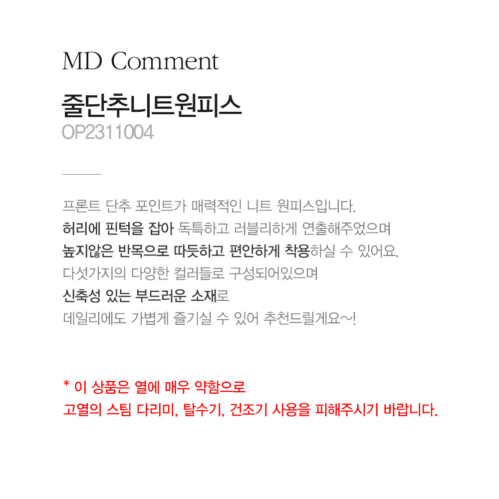 - * 이 상품은 열에 매우 약함으로 고열의 스팀 다리미, 탈수기, 건조기 사용을 피해주시기 바랍니다.
