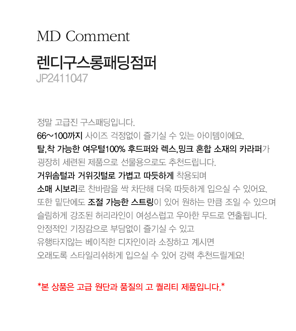 소재 폴리에스터100% / 충전재:거위솜털80%,거위깃털20% / 후드:폭스퍼100% / 카라:렉스퍼50%,밍크퍼50%