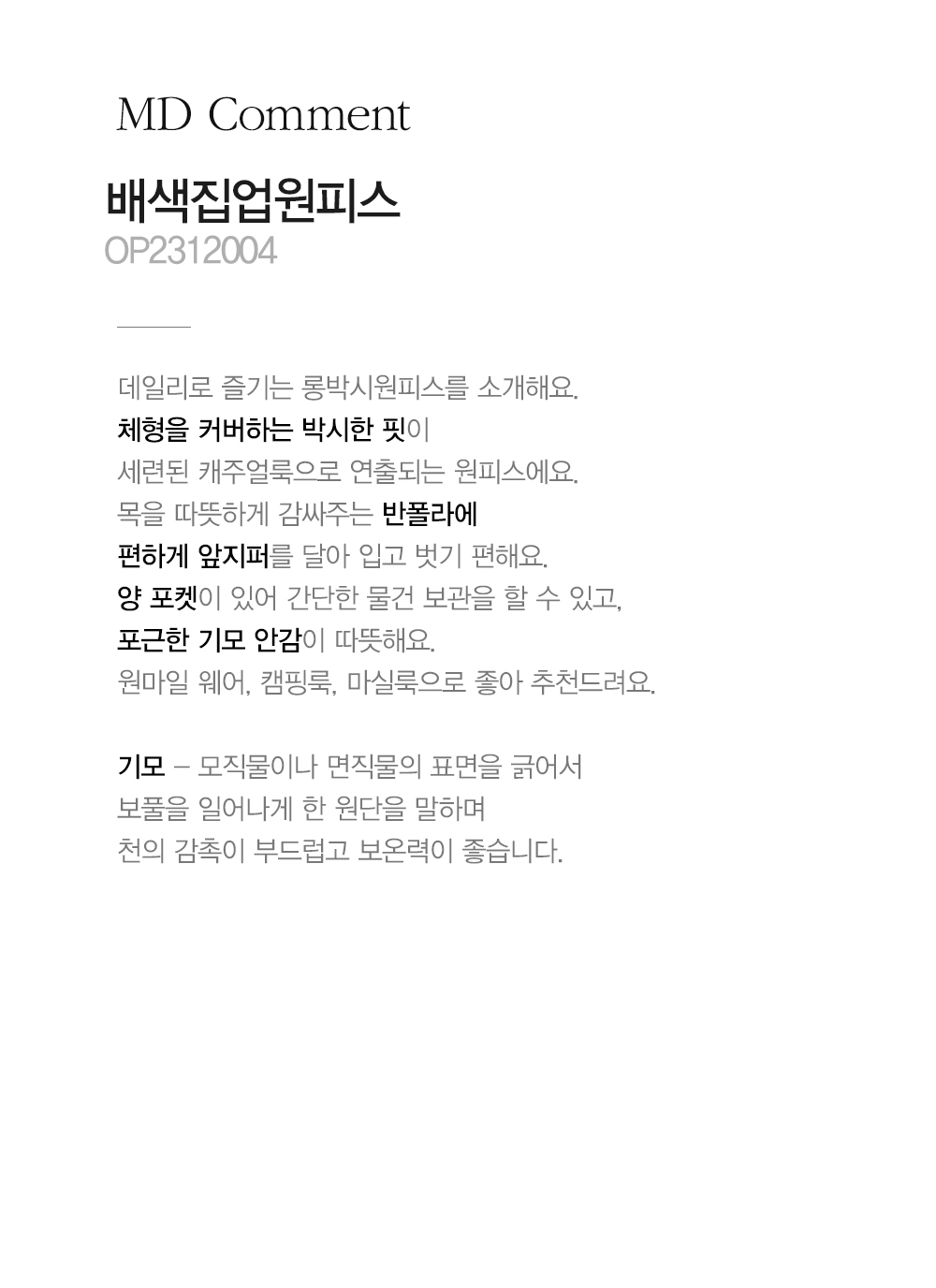 기모 - 모직물이나 면직물의 표면을 긁어서 보풀을 일어나게 한 원단을 말하며