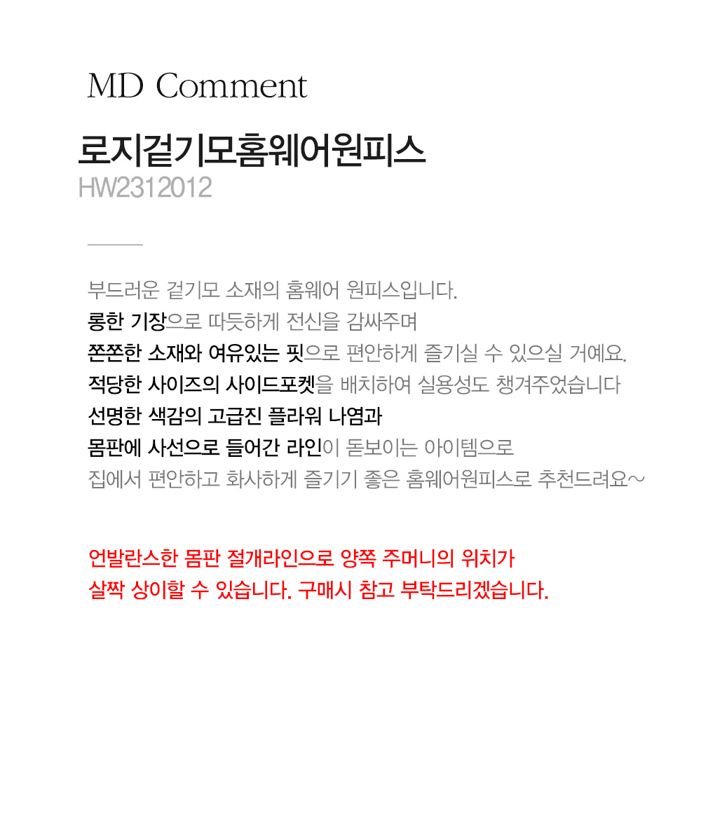 - 언발란스한 몸판 절개라인으로 양쪽 주머니의 위치가 살짝 상이할 수 있습니다. 구매시 참고 부탁드리겠습니다.