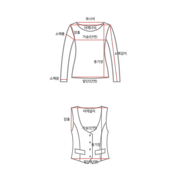 사이즈 총장(속/겉) 어깨(속/겉) 가슴단면(속/겉) 소매길이(속) 암홀단면(속/겉) 소매통단면(속) 소매끝단면(속) 밑단면(속/겉)