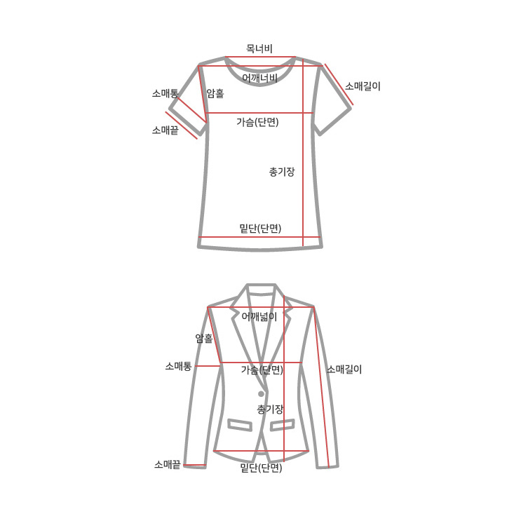 사이즈 총장(속/겉) 어깨(속/겉) 가슴단면(속/겉) 소매길이(속/겉) 암홀단면(속/겉) 소매통단면(속/겉) 소매끝단면(속/겉) 밑단면(속/겉)
