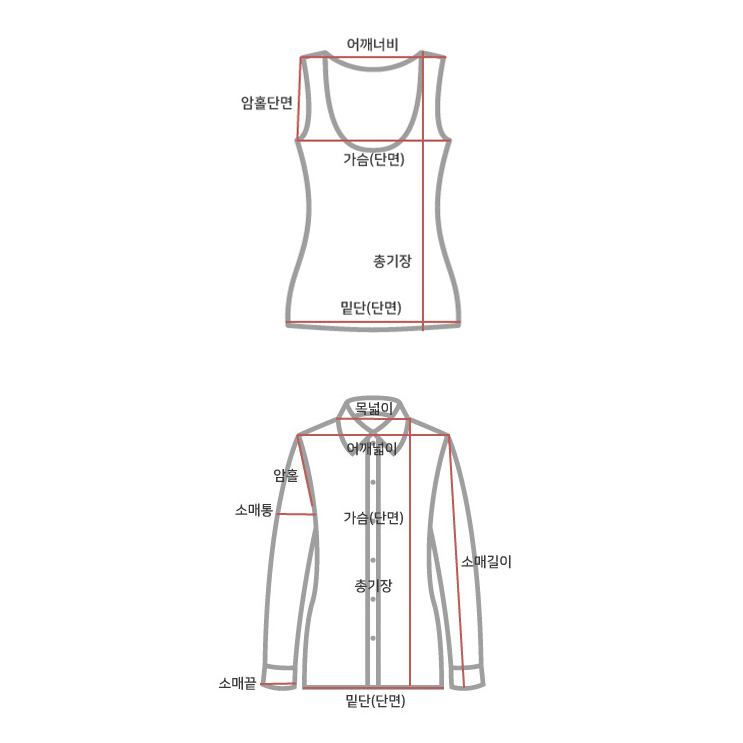 사이즈 총장(속/겉) 어깨(속/겉) 가슴단면(속/겉) 소매길이(겉) 암홀단면(속/겉) 소매통단면(겉) 소매끝단면(겉) 밑단면(속/겉) 목너비(속)