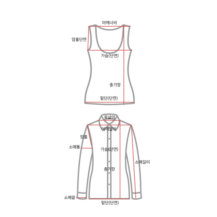 ㅅ이즈 총장(속/겉) 어깨(속/겉) 가슴단면(속/겉) 소매길이(겉) 암홀단면(속/겉) 소매통단면(겉) 소매끝단면(겉) 밑단면(속/겉) 목너비(속)