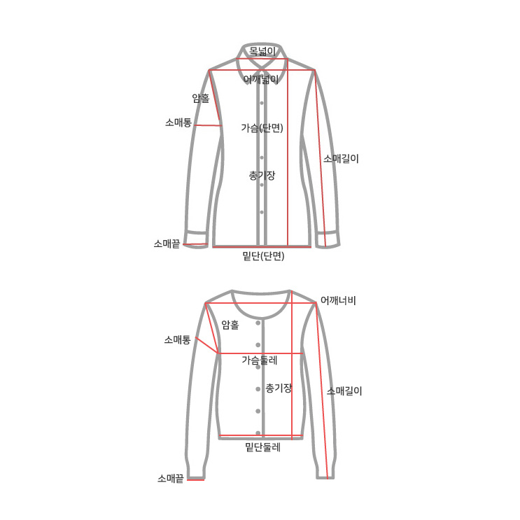 사이즈 총장(속/겉) 어깨(속/겉) 가슴단면(속/겉) 소매길이(속/겉) 암홀단면(속/겉) 소매통단면(속/겉) 소매끝단면(속/겉) 밑단면(속/겉) 목너비(속)