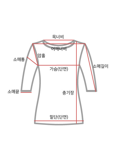 사이즈 총장 어깨 가슴(단면) 소매길이 암홀(단면) 소매통(단면) 소매단(단면) 밑단(단면) 목너비