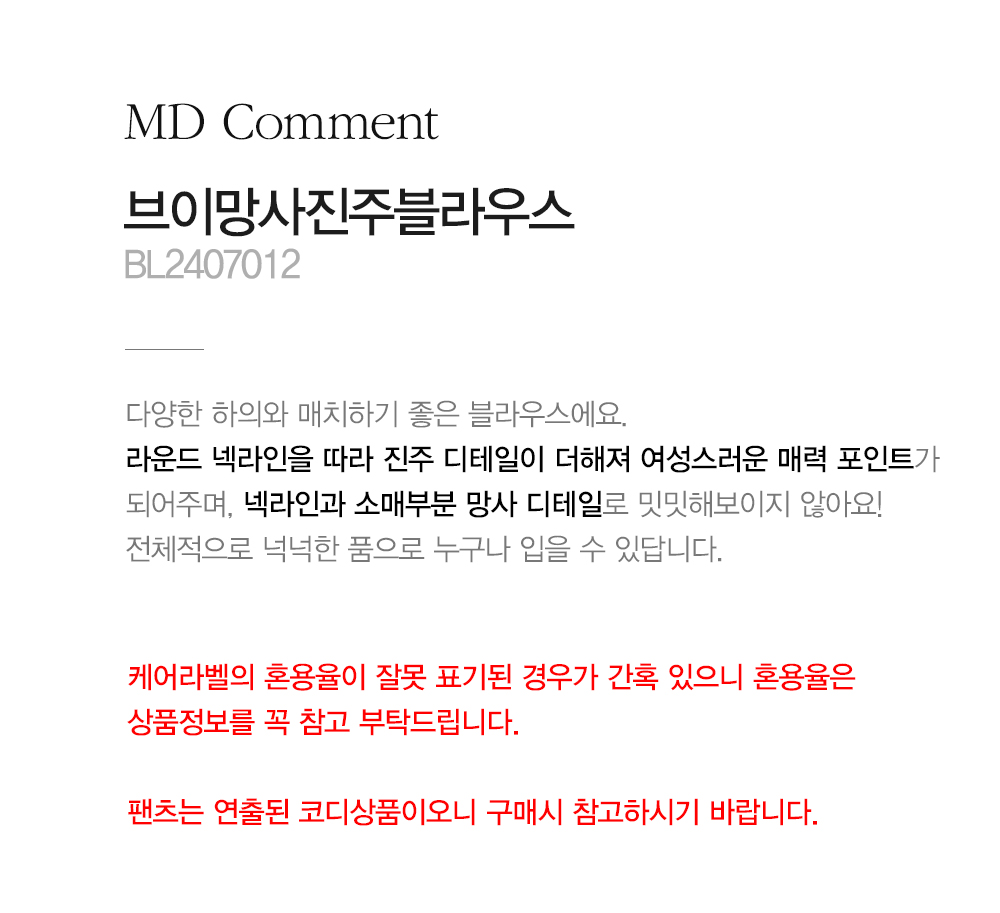 - 케어라벨의 혼용율이 잘못 표기된 경우가 간혹 있으니 혼용율은 상품정보를 꼭 참고 부탁드립니다.
