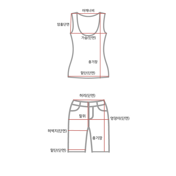 사이즈 총장(상/하) 어깨(단면)/허리(단면) 가슴(단면)/엉덩이(단면) 밑위(단면) 암홀(단면)/허벅지(단면) 밑단(단면)(상/하) 목너비