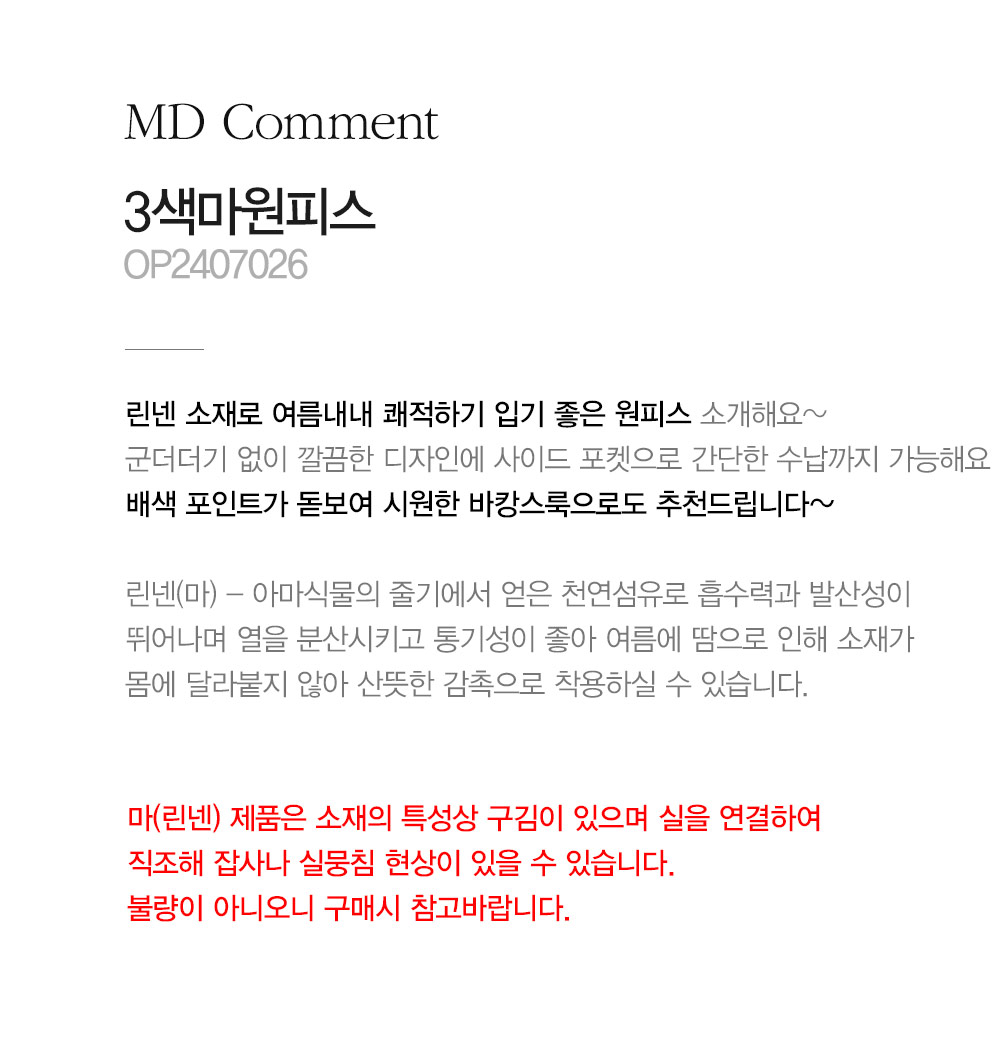 - 마(린넨) 제품은 소재의 특성상 구김이 있으며 실을 연결하여 직조해 잡사나 실뭉침 현상이 있을 수 있습니다. 불량이 아니오니 구매시 참고바랍니다.