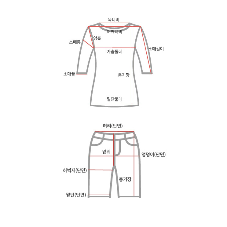 사이즈 총장(상/하) 어깨(단면)/허리(단면) 가슴(단면)/엉덩이(단면) 소매길이(단면)/밑위(단면) 암홀(단면)/허벅지(단면) 소매통(단면) 소매단(단면) 밑단(단면)(상/하) 목너비