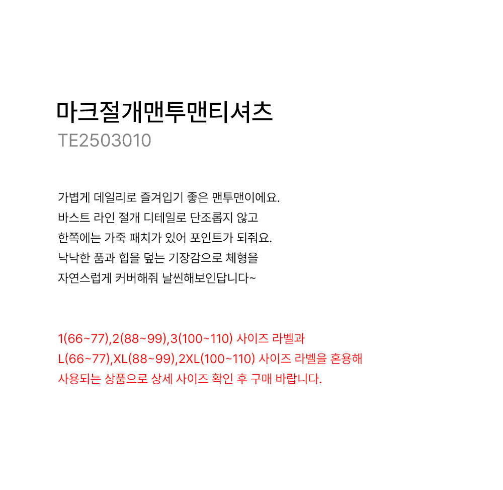 - 1(66~77),2(88~99),3(100~110) 사이즈 라벨과 L(66~77),XL(88~99),2XL(100~110) 사이즈 라벨을 혼용해 사용되는 상품으로 상세 사이즈 확인 후 구매 바랍니다.