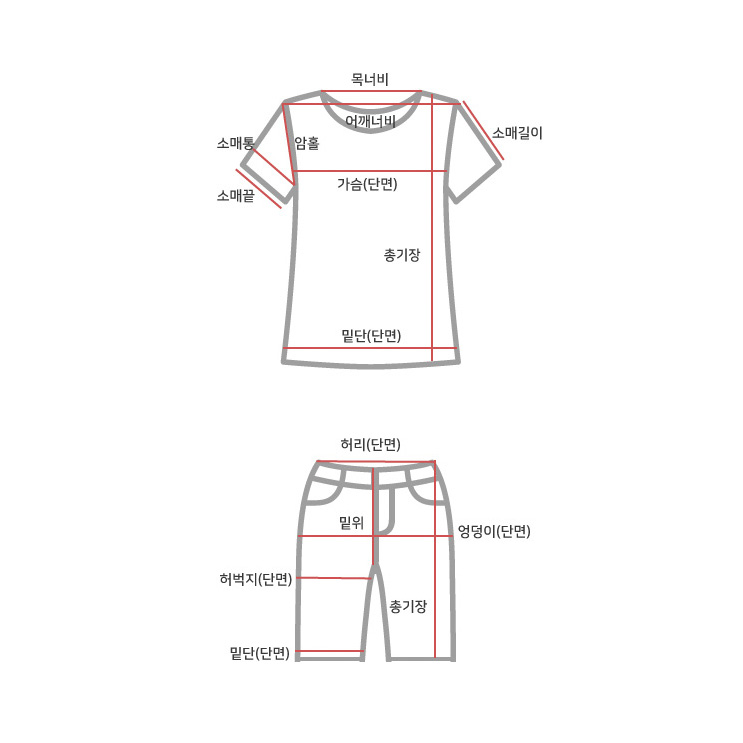 사이즈 총장(상/하) 어깨(단면)/허리(단면) 가슴(단면)/엉덩이(단면) 소매길이(단면)/밑위(단면) 암홀(단면)/허벅지(단면) 소매통(단면) 소매단(단면) 밑단(단면)(상/하) 목너비