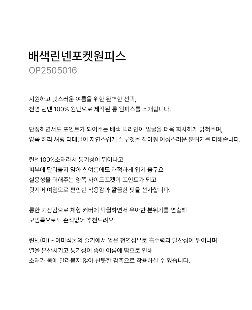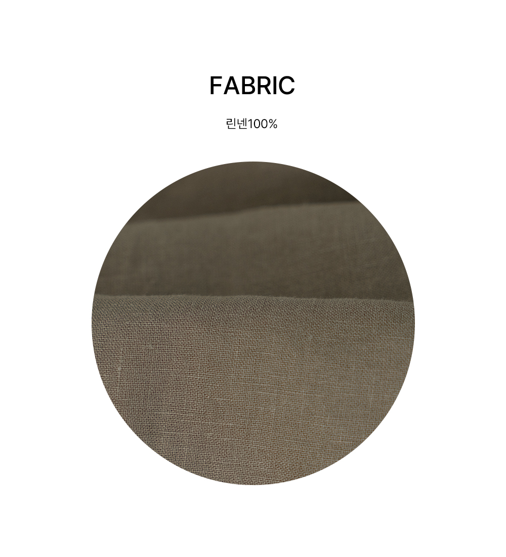 린넨(마) - 아마식물의 줄기에서 얻은 천연섬유로 흡수력과 발산성이 뛰어나며 열을 분산시키고 통기성이 좋아 여름에 땀으로 인해 소재가 몸에 달라붙지 않아 산뜻한 감촉으로 착용하실 수 있습니다.