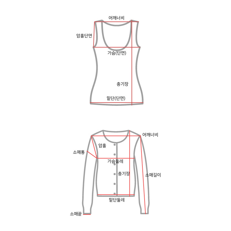 사이즈 총장(속/겉) 어깨(속/겉) 가슴(단면)(속/겉) 소매길이(겉) 암홀(단면)(속/겉) 소매통(단면)(겉) 소매단(단면)(겉) 밑단(단면)(속/겉) 목너비(속)
