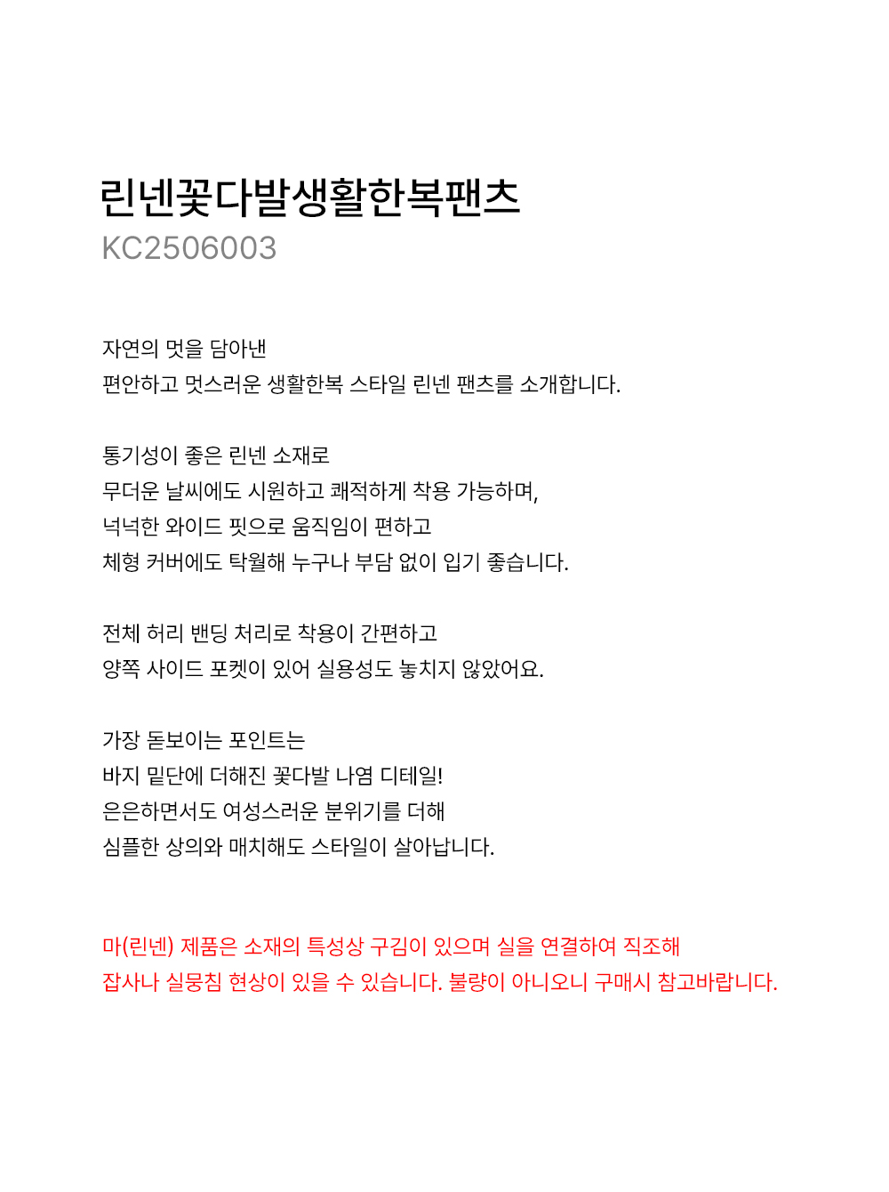 - 마(린넨) 제품은 소재의 특성상 구김이 있으며 실을 연결하여 직조해 잡사나 실뭉침 현상이 있을 수 있습니다. 불량이 아니오니 구매시 참고바랍니다.