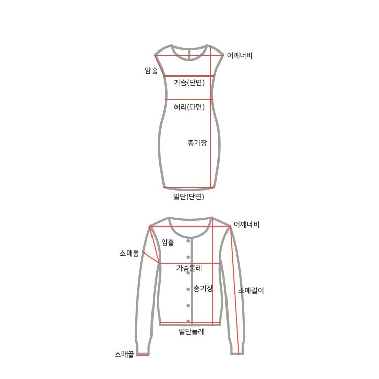 사이즈 총장(속/겉) 어깨(겉) 가슴(단면)(속/겉) 소매길이(겉) 암홀(단면)(속/겉) 소매통(단면)(겉) 소매단(단면)(겉) 밑단(단면)(속/겉)