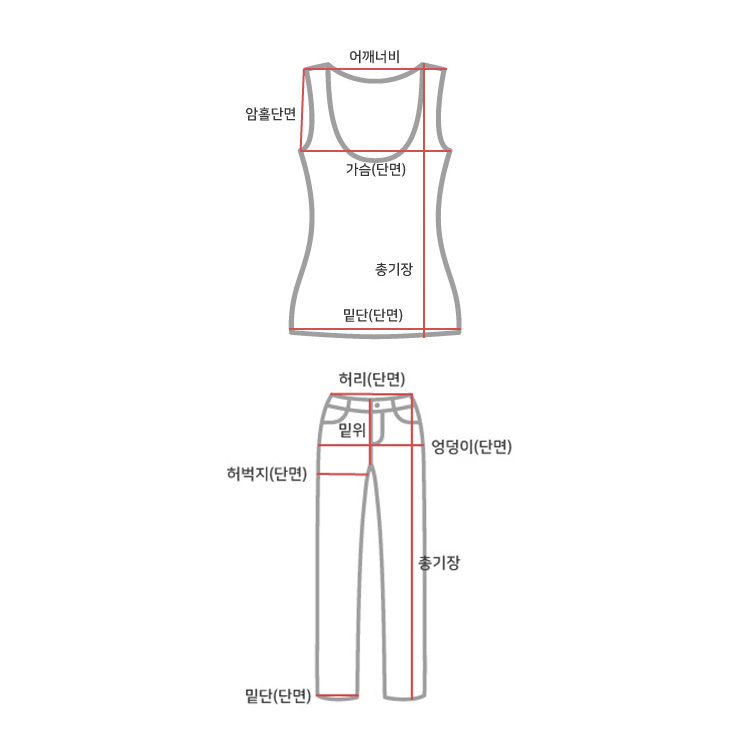 사이즈 총장(상/하) 어깨(단면)/허리(단면) 가슴(단면)/엉덩이(단면) 밑위(단면) 암홀(단면)/허벅지(단면) 밑단(단면)(상/하) 목너비