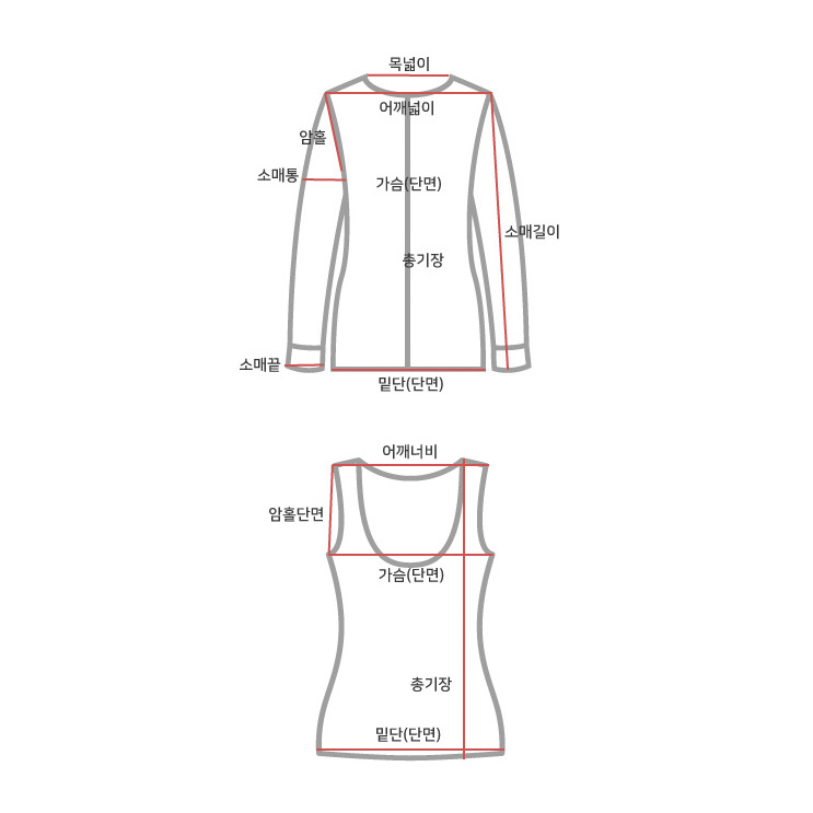 사이즈 총장(속/겉) 가슴(단면)(속/겉) 소매길이(겉) 소매통(단면)(겉) 소매단(단면)(겉) 밑단(단면)(속/겉)