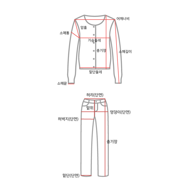 사이즈 총장(상/하) 어깨(단면)/허리(단면) 가슴(단면)/엉덩이(단면) 소매길이(단면)/밑위(단면) 암홀(단면)/허벅지(단면) 소매통(단면) 소매단(단면) 밑단(단면)(상/하)