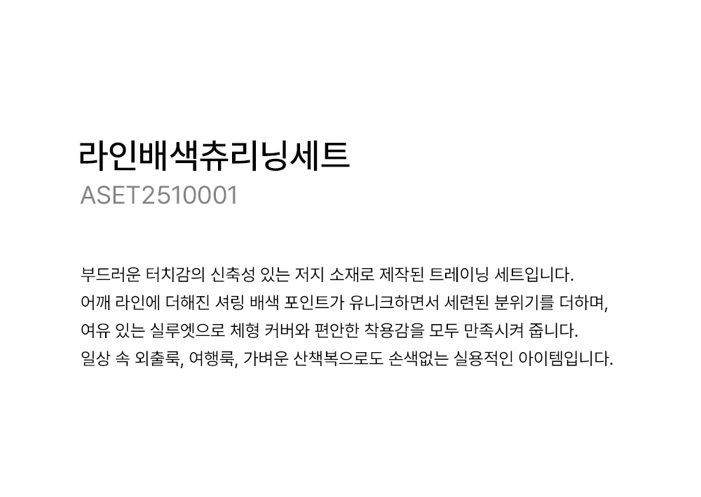 사이즈 총장(상/하) 어깨(단면)/허리(단면) 가슴(단면)/엉덩이(단면) 소매길이(단면)/밑위(단면) 암홀(단면)/허벅지(단면) 소매통(단면) 소매단(단면) 밑단(단면)(상/하)
