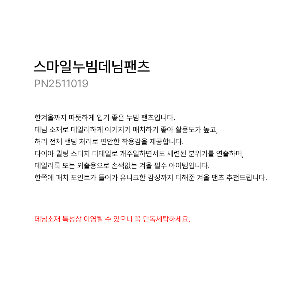 데님제품 및 염색한 원단제품은 물빠짐 현상이 일어날 수 있으므로 반드시 단독세탁 해 주셔야 합니다.