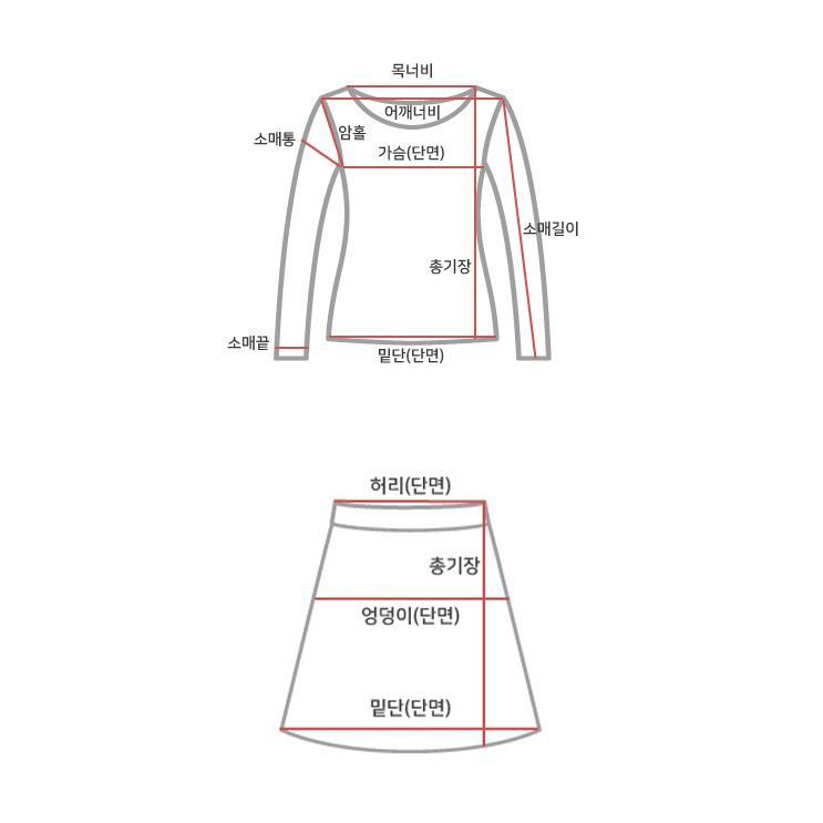 사이즈 총장(상/하) 어깨(단면)/허리(단면) 가슴(단면)/엉덩이(단면) 소매길이(단면)/밑위(단면) 암홀(단면)/허벅지(단면) 소매통(단면) 소매단(단면) 밑단(단면)(상/하)