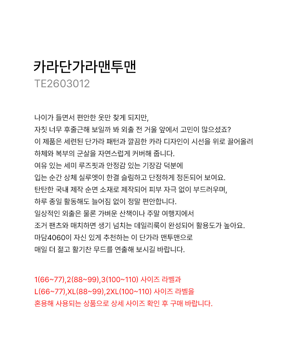 - 1(66~77),2(88~99),3(100~110) 사이즈 라벨과 L(66~77),XL(88~99),2XL(100~110) 사이즈 라벨을 혼용해 사용되는 상품으로 상세 사이즈 확인 후 구매 바랍니다.