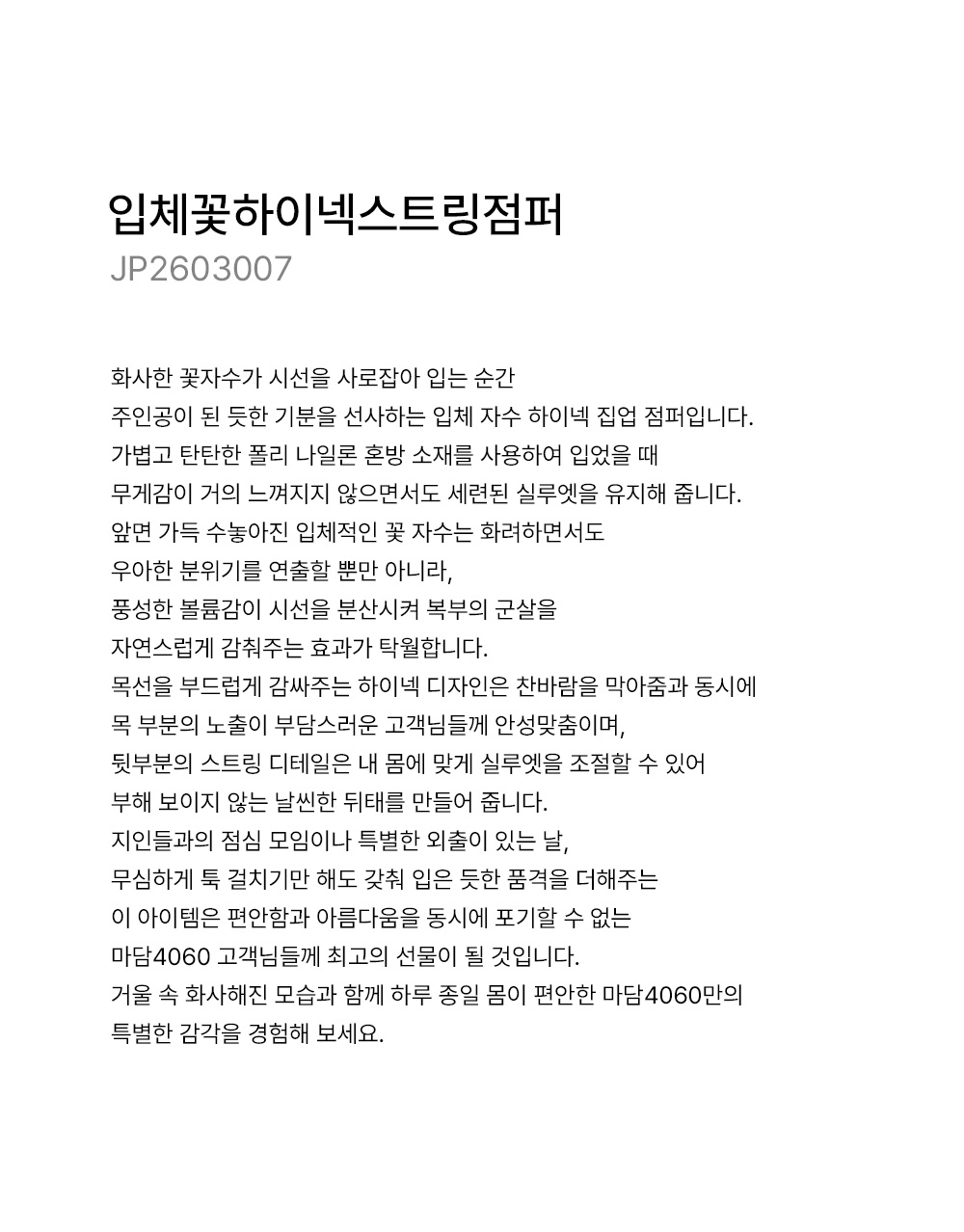 마담4060의 모든 의류 제품은 처음 1~2회 드라이크리닝을 권장합니다.