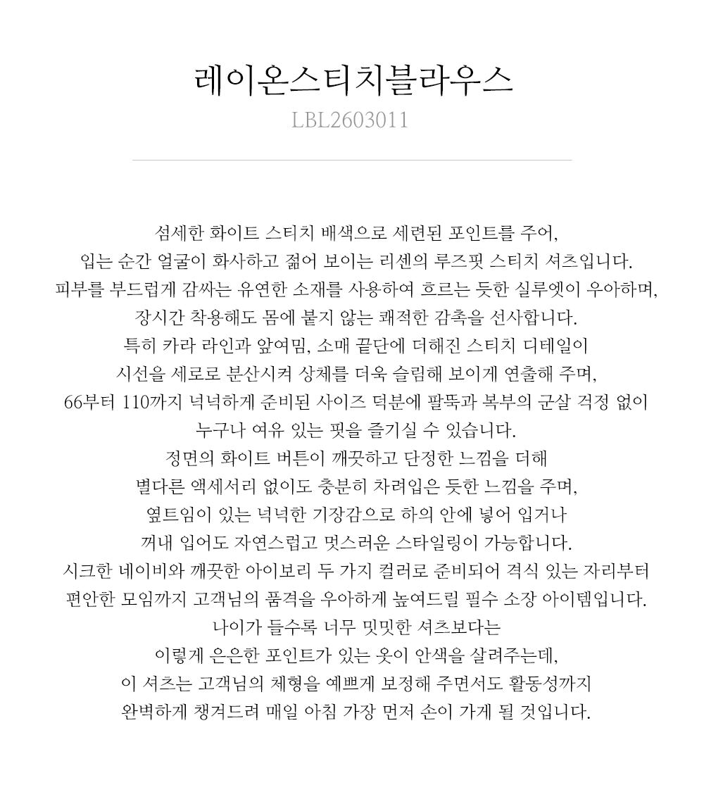 마담4060의 모든 의류 제품은 처음 1~2회 드라이크리닝을 권장합니다.