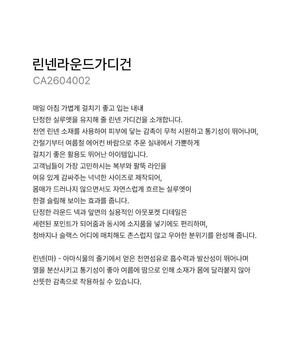 - 린넨(마) - 아마식물의 줄기에서 얻은 천연섬유로 흡수력과 발산성이 뛰어나며 열을 분산시키고 통기성이 좋아 여름에 땀으로 인해 소재가 몸에 달라붙지 않아 산뜻한 감촉으로 착용하실 수 있습니다. 세탁방법 땀에 의해 쉽게 변색될 수 있으므로 착용 후 바로바로 세탁을 해주셔야 하며 물세탁을 하신다면 중성세제를 사용하여 조심스럽게 섬유조직이 상하지 않도록 해야합니다. 세탁 건조기 사용을 자제하고 햇빛에 노출될수록 손상이나 변색가능성이 커 그늘에서 구김없이 말려주어야 합니다.
