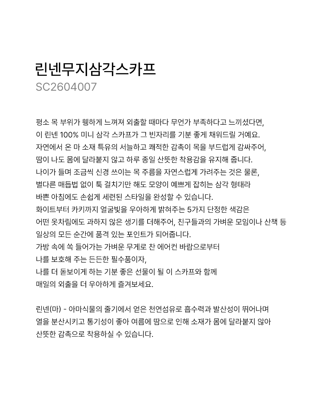 - 린넨(마) - 아마식물의 줄기에서 얻은 천연섬유로 흡수력과 발산성이 뛰어나며 열을 분산시키고 통기성이 좋아 여름에 땀으로 인해 소재가 몸에 달라붙지 않아 산뜻한 감촉으로 착용하실 수 있습니다. 세탁방법 땀에 의해 쉽게 변색될 수 있으므로 착용 후 바로바로 세탁을 해주셔야 하며 물세탁을 하신다면 중성세제를 사용하여 조심스럽게 섬유조직이 상하지 않도록 해야합니다. 세탁 건조기 사용을 자제하고 햇빛에 노출될수록 손상이나 변색가능성이 커 그늘에서 구김없이 말려주어야 합니다.