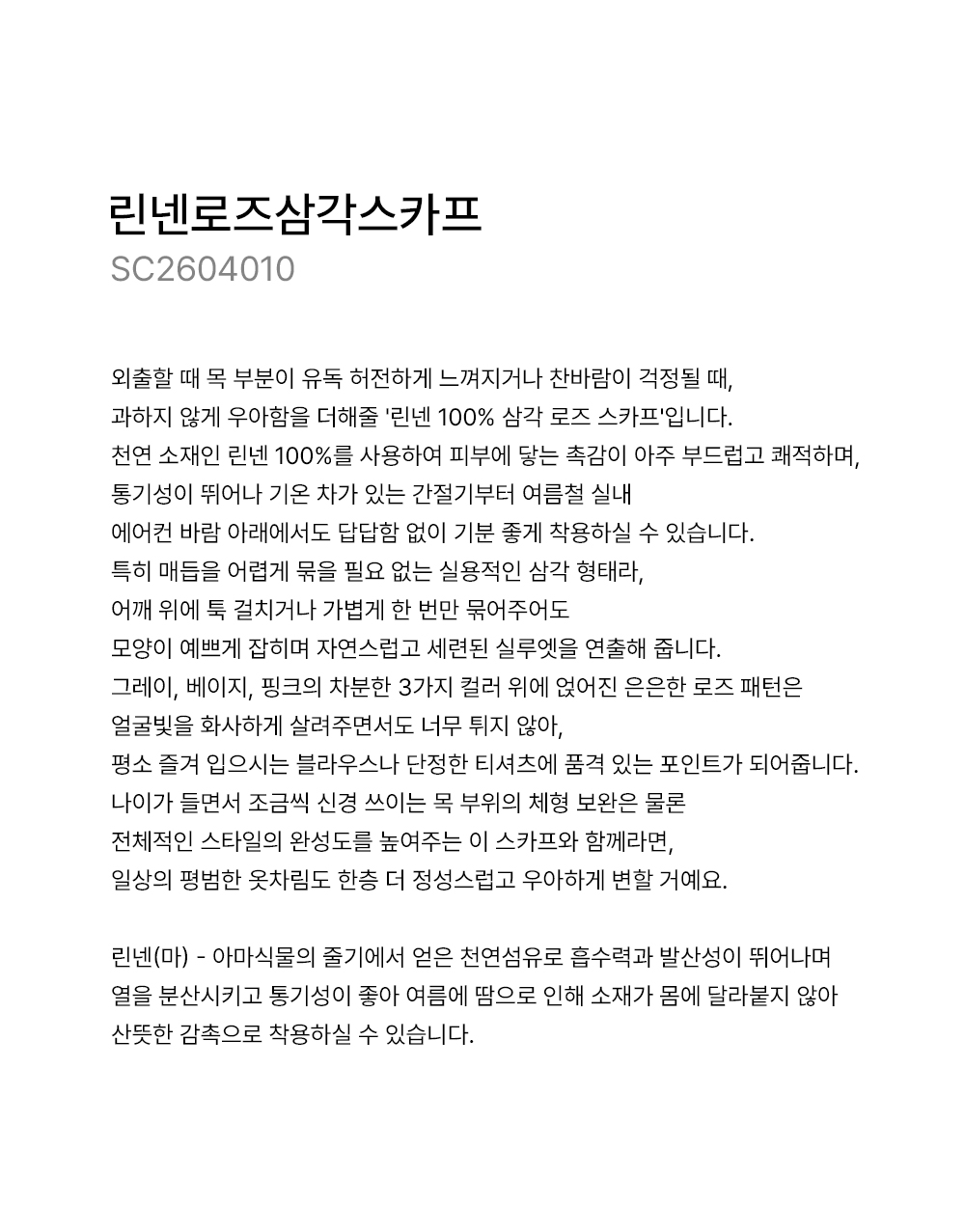 - 린넨(마) - 아마식물의 줄기에서 얻은 천연섬유로 흡수력과 발산성이 뛰어나며 열을 분산시키고 통기성이 좋아 여름에 땀으로 인해 소재가 몸에 달라붙지 않아 산뜻한 감촉으로 착용하실 수 있습니다. 세탁방법 땀에 의해 쉽게 변색될 수 있으므로 착용 후 바로바로 세탁을 해주셔야 하며 물세탁을 하신다면 중성세제를 사용하여 조심스럽게 섬유조직이 상하지 않도록 해야합니다. 세탁 건조기 사용을 자제하고 햇빛에 노출될수록 손상이나 변색가능성이 커 그늘에서 구김없이 말려주어야 합니다.